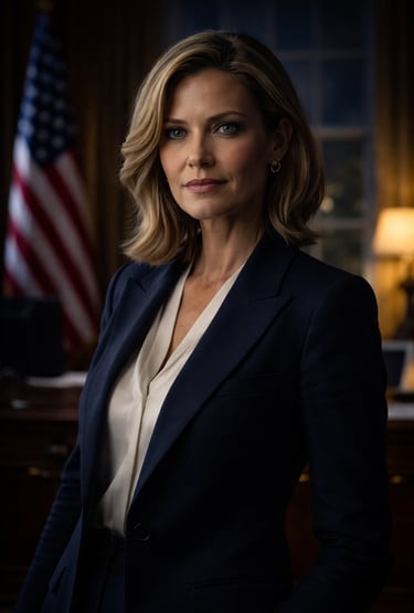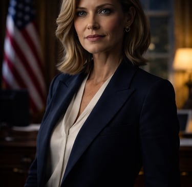 Pragmatic centrist. Decades in politics. She knows exactly how to perform under pressure — and never lets her face give away what's going on inside. She was the "human counterweight" that convinced conservative voters to trust the ticket.